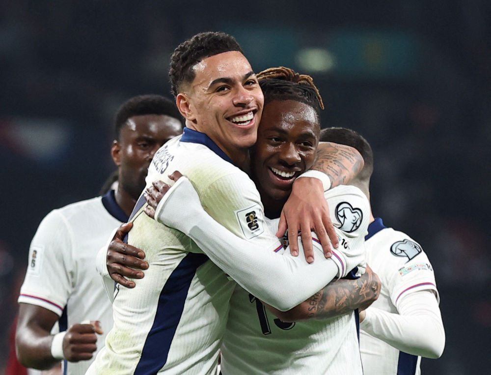 3月24日,英格蘭隊球員埃澤(前右)在進球后和隊友羅杰斯慶祝。新華社/路透
