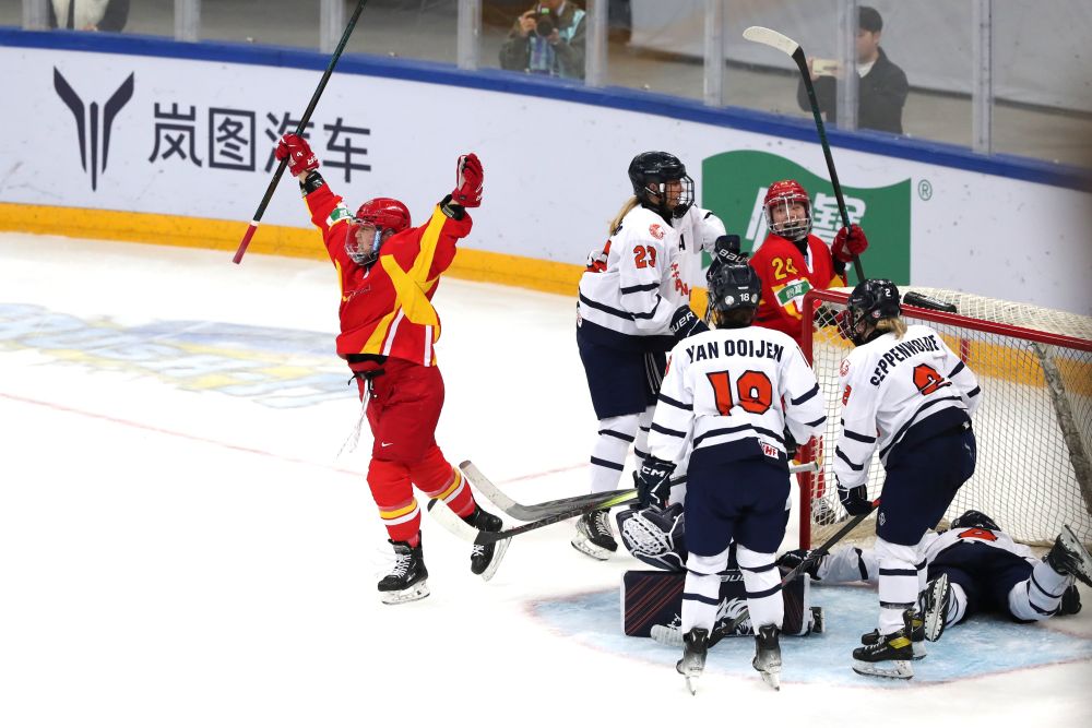比賽伊始,雙方攻勢積極。第三分鐘,荷蘭隊打出精妙配合,科拉德門前補射得手,冰球從中國隊門將詹佳慧腿下滑入球網(wǎng),比分變?yōu)?:1。