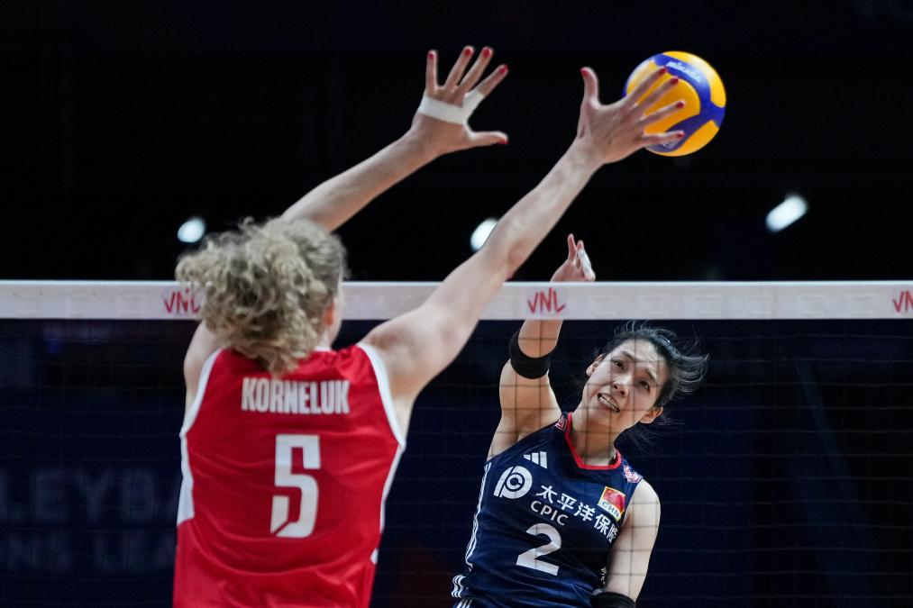 6月5日,波蘭隊球員斯蒂夏克(左)在比賽中扣球。新華社記者 鞠煥宗 攝