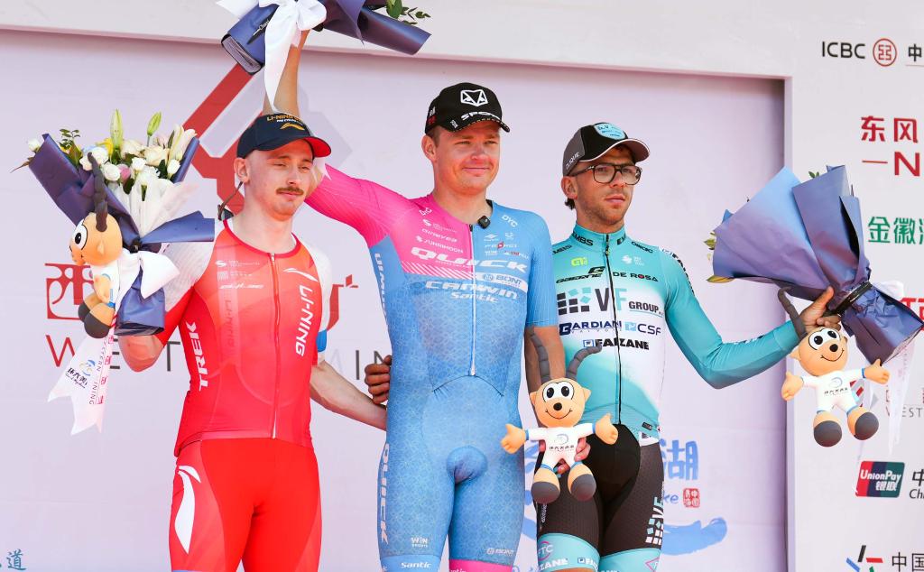7月9日,參賽選手在比賽中騎行。新華社記者 齊芷玥 攝 經(jīng)過激烈爭奪,來自愛沙尼亞快客車隊的愛沙尼亞車手拉亞斯·馬丁在終點沖刺大戰(zhàn)中力壓8日賽段冠軍——李寧之星車隊車手謝爾比·亞歷山大,奪得賽段勝利。亞歷山大名列賽段第二,意大利巴迪亞尼車隊車手扎農(nóng)塞洛·恩洛科獲得賽段第三名。