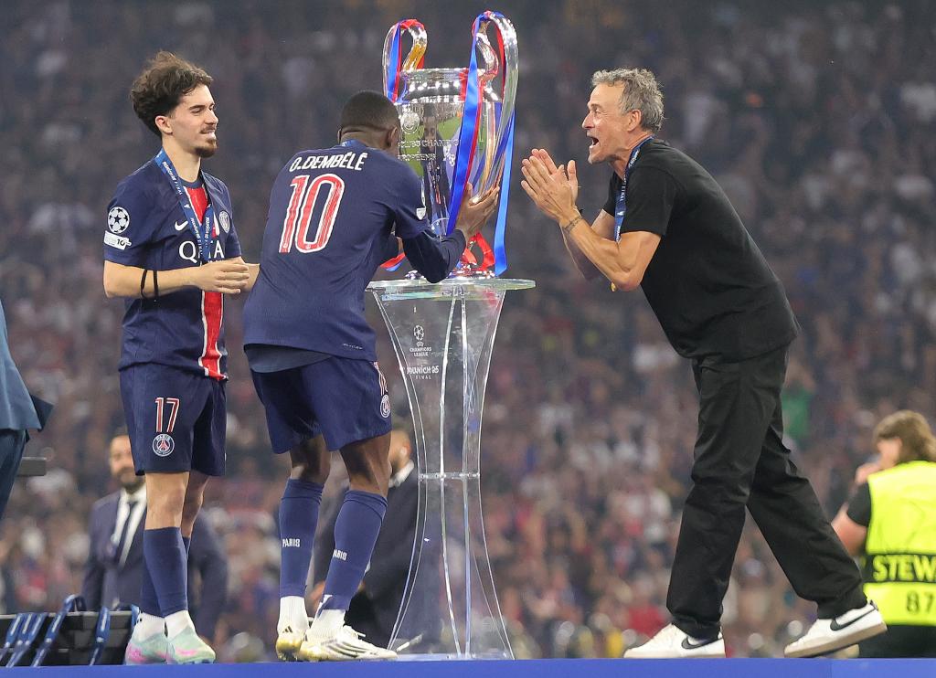 5月31日,巴黎圣日耳曼隊主教練恩里克(右)與球員登貝萊(中)、維蒂尼亞慶祝。當(dāng)日,在德國慕尼黑進行的2024-2025賽季歐冠聯(lián)賽決賽中,法甲巴黎圣日耳曼隊5比0擊敗意甲國際米蘭隊,收獲隊史第一座歐冠冠軍獎杯。新華社發(fā)(菲利普·魯伊茲攝)
