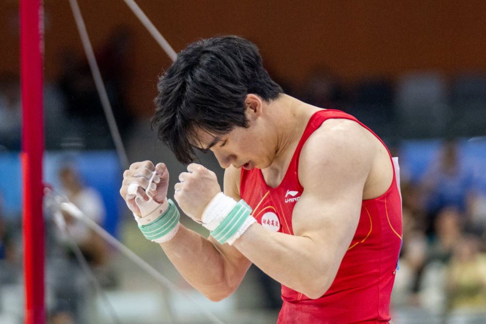 男子單杠決賽是當晚焦點,此前比賽日未能摘金的張博恒出戰(zhàn)。他做出多個高難度動作,平穩(wěn)落地之后緊握雙拳慶祝,以14.860分奪冠。江蘇隊何翔、北京隊肖若騰分獲銀牌、銅牌。