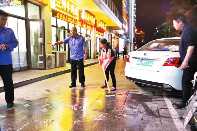 據(jù)了解,此次行動共出動執(zhí)法人員近30名。通過專項(xiàng)整治,進(jìn)一步規(guī)范了城區(qū)商鋪的經(jīng)營秩序,提升了居民的環(huán)保意識和文明意識,營造了和諧文明的市容環(huán)境。圖為執(zhí)法人員與商家一同清理店鋪門前油污。(記者張志遠(yuǎn) 攝影報(bào)道)