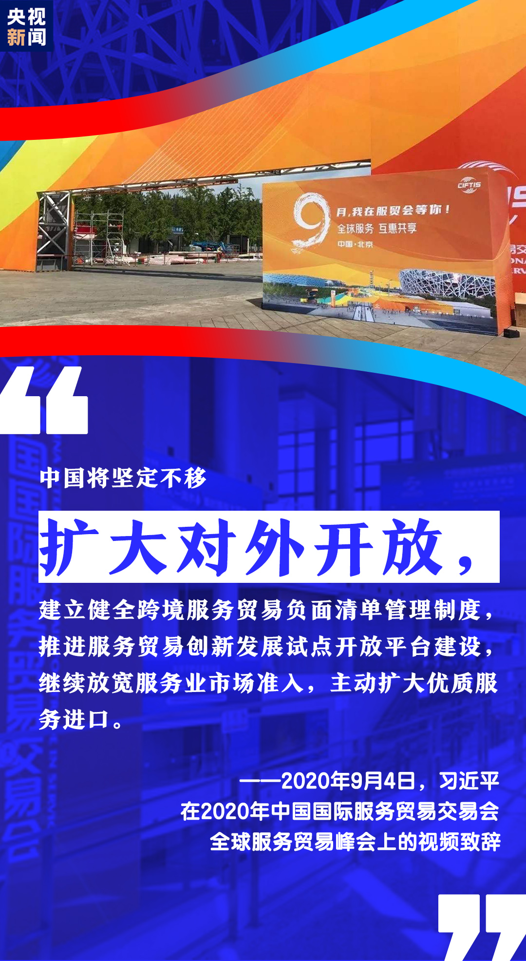 9月4日,2020年中國國際服務貿(mào)易交易會全球服務貿(mào)易峰會在北京開幕。習近平主席通過視頻方式在峰會上致辭。