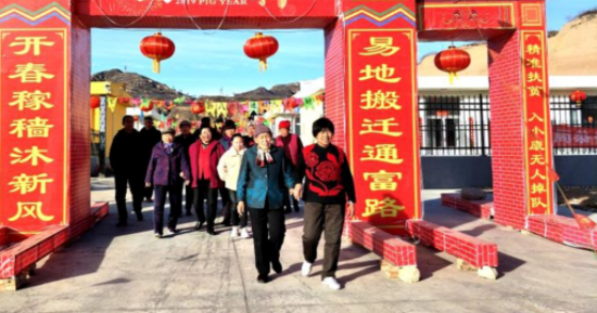 大峪坪易地搬遷點是晉中市太谷區(qū)完成整村搬遷入住的第一村,春節(jié)前夕,村兩委班子張羅著將小區(qū)布置一新,大門口制作了喜慶醒目的迎春牌樓,牌樓兩側(cè)寫有群眾自編的新春聯(lián),上聯(lián)是:開春稼穡沐新風(fēng),下聯(lián)是:易地搬遷通富路。東側(cè)的門柱上寫著:精準(zhǔn)扶貧,入小康無人掉隊。