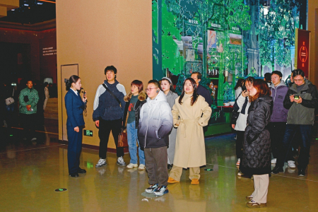 2月8日,運城市河?xùn)|歷史文化展示中心內(nèi),游客正在數(shù)字互動屏幕前駐足查看歷史資料。楊晨玉攝