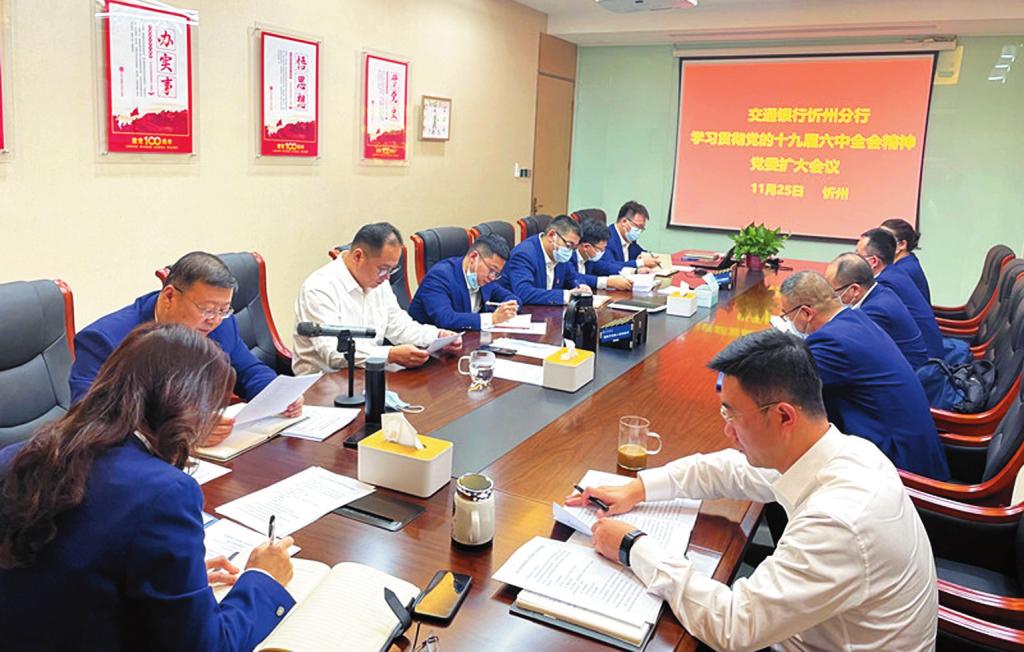 11月25日,交通銀行忻州分行召開黨委擴(kuò)大會議,傳達(dá)學(xué)習(xí)貫徹黨的十九屆六中全會精神,全會精神在交行忻州分行引起熱烈反響,廣大干部員工迅速掀起學(xué)習(xí)貫徹全會精神熱潮。
