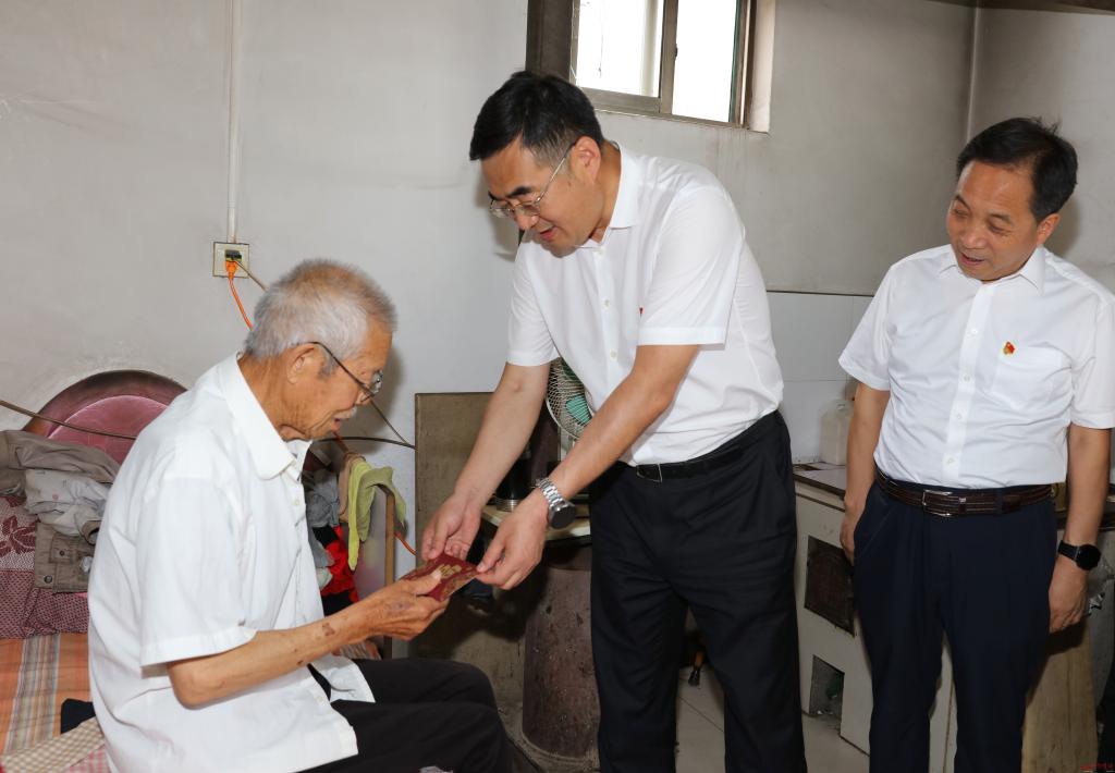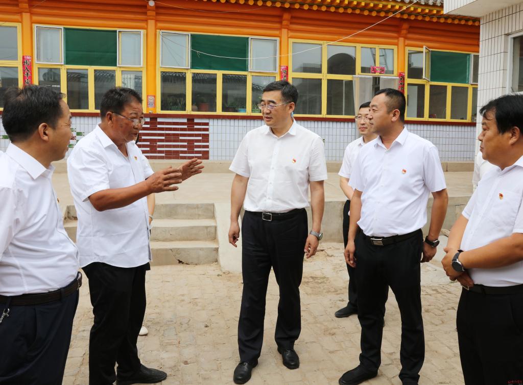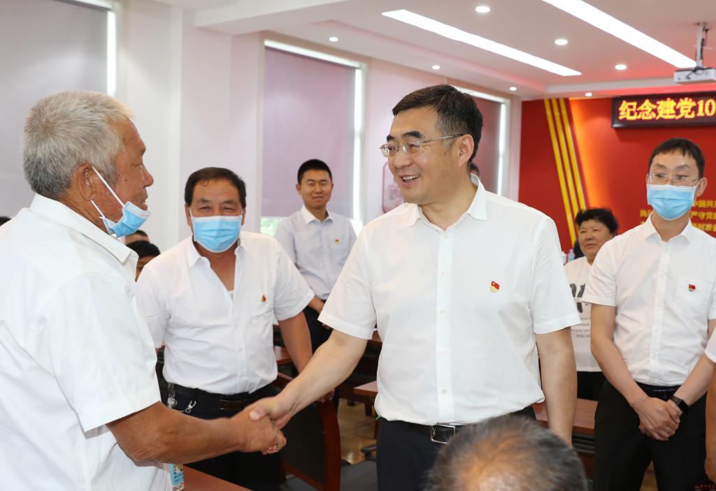 在弓家莊村。范濤 攝 6月30日,市委副書記、市長李建國深入原平市王家莊鄉(xiāng)弓家莊村,走訪慰問宋還順、宋艮貴等困難老黨員,調研了解鄉(xiāng)村治理情況和村民大棚蔬菜產業(yè)發(fā)展情況,圍繞“鄉(xiāng)村振興”為基層黨員干部講授專題黨課,慶祝建黨101周年。市政府秘書長張艮生和市鄉(xiāng)村振興部門負責人等參加。