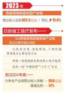 省工信廳日前發(fā)布《山西省高端裝備制造產(chǎn)業(yè)鏈2024年行動計(jì)劃》,確立年度推進(jìn)目標(biāo):以軌道交通、智能煤機(jī)、工程機(jī)械等領(lǐng)域?yàn)橹饕l(fā)展方向,突破一批高端裝備制造核心技術(shù)瓶頸,培養(yǎng)一批“專精特新”“小巨人”企業(yè),提升全產(chǎn)業(yè)鏈科技創(chuàng)新能力,強(qiáng)化高端裝備制造供應(yīng)鏈穩(wěn)定性和配套能力。并提出,到2024年底,力爭全產(chǎn)業(yè)鏈營業(yè)收入突破950億元,增速達(dá)到12%。
