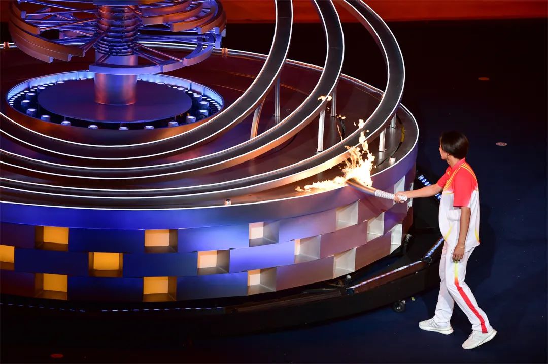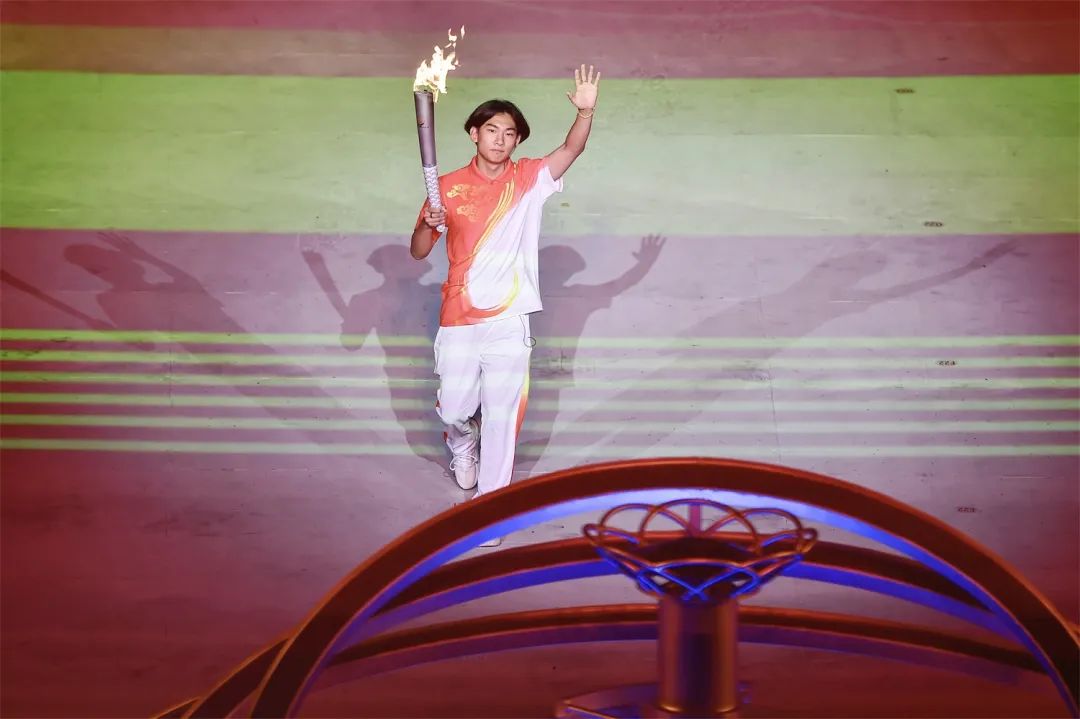 開幕式之夜,最為激動人心的就是點火時刻。在射擊世界冠軍張益梵、鄉(xiāng)村干部王春、環(huán)衛(wèi)工人孫秀蘭、大國工匠官生花、公交司機馮冰依次傳遞過后,火炬來到了最后一棒火炬手、北京冬奧會冠軍蘇翊鳴的手中。主火炬塔點火裝置以山西民俗“旺火”為設計依據,采用清潔能源“微火”點燃的方式。蘇翊鳴手持火炬,在萬眾矚目之下,以“微火”點“旺火”,歷史、現(xiàn)在與未來,在這一刻融匯賡續(xù)。