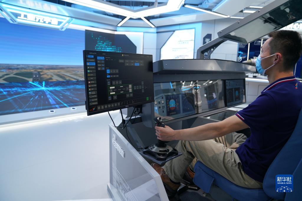 5月11日,在上海城市數(shù)字化轉(zhuǎn)型體驗館,工作人員操作一款數(shù)字化飛行仿真訓(xùn)練平臺。新華社記者 馬寧 攝