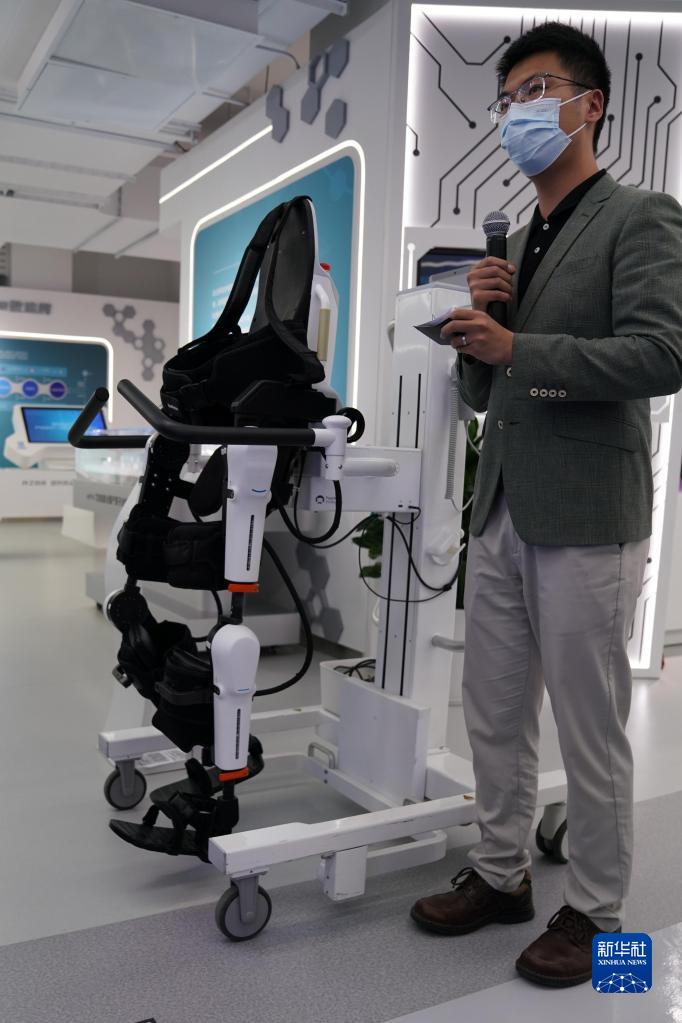 5月11日,在上海城市數(shù)字化轉(zhuǎn)型體驗館“解碼生命”區(qū)域,工作人員介紹一款下肢康復(fù)機器人。新華社記者 馬寧 攝