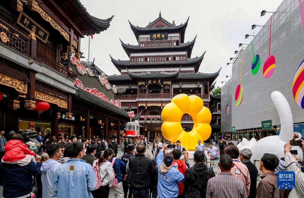 5月7日,市民游客在上海豫園商城中心廣場觀看街頭藝術表演。新華社記者 劉穎 攝