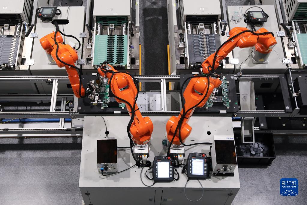 5月22日,在紫光恒越(杭州)技術(shù)有限公司“未來工廠”,機械臂在工作中。新華社記者 杜瀟逸 攝