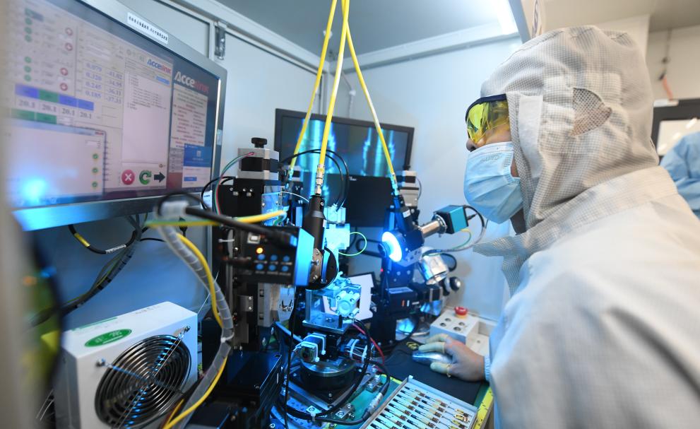 武漢光迅科技股份有限公司生產(chǎn)車(chē)間內(nèi),技術(shù)人員在光模塊生產(chǎn)線作業(yè)。新華社記者程敏 攝