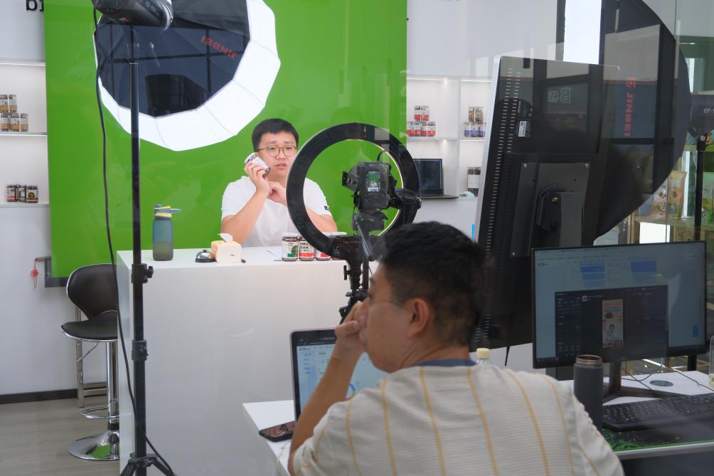 9月6日,銷(xiāo)售人員正在德祥實(shí)業(yè)有限公司內(nèi)進(jìn)行電商直播。新華社記者 趙鑫虎 攝