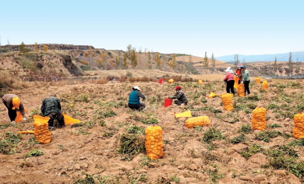 種植戶正忙著將機器采挖好的土豆分揀、裝袋。