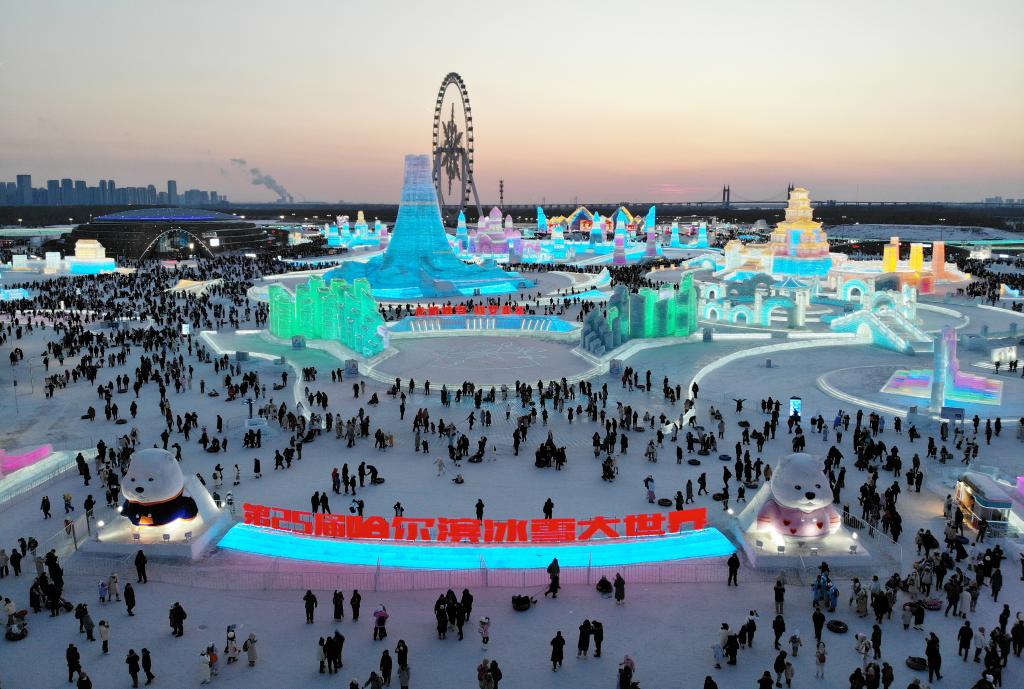 2月15日,游客在哈爾濱冰雪大世界園區(qū)內(nèi)游玩(無人機照片)。新華社記者 王建威 攝