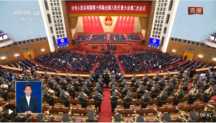 3月5日上午9時(shí),十四屆全國人大二次會(huì)議在人民大會(huì)堂開幕,全體起立,高唱中華人民共和國國歌。