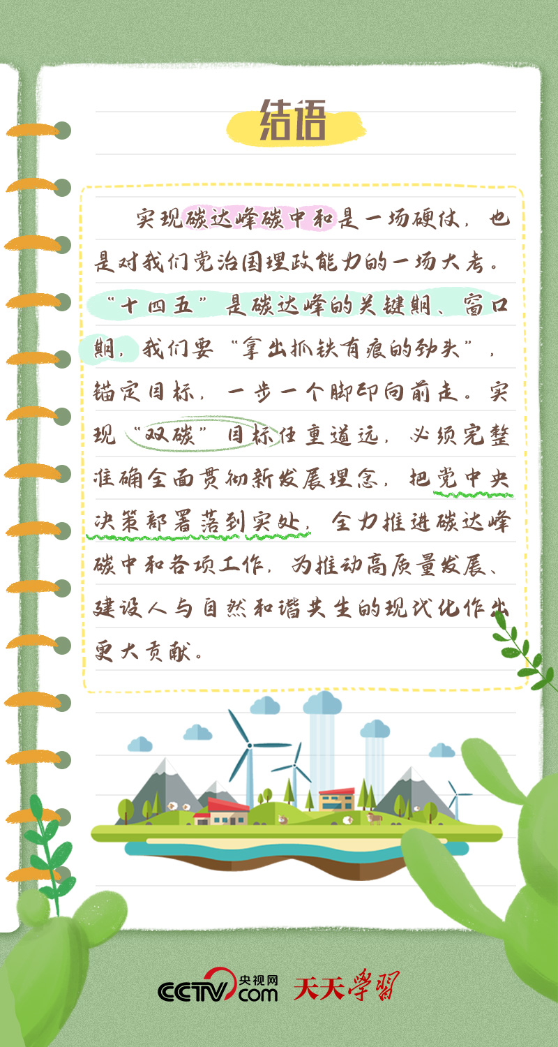 天天學(xué)習(xí)今年全國兩會,習(xí)近平總書記在政協(xié)聯(lián)組會上,對“雙碳”工作作出最新部署??倳洀娬{(diào):“全面準確落實精準治污、科學(xué)治污、依法治污方針,推動經(jīng)濟社會發(fā)展綠色化、低碳化,加強資源節(jié)約集約循環(huán)利用,拓展生態(tài)產(chǎn)品價值實現(xiàn)路徑,積極穩(wěn)妥推進碳達峰碳中和,為高質(zhì)量發(fā)展注入新動能、塑造新優(yōu)勢?!?/p>