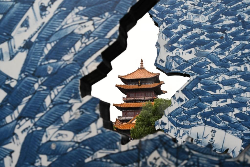 透過(guò)創(chuàng)意青花瓷片拍攝的龍珠閣。新華社記者 隋尚君 攝