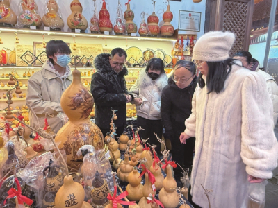 葫蘆烙畫吸引眼球。本報記者高瑋攝 祥蛇納福至,新歲瑞光盈。忻州古城張燈結(jié)彩,大年初一,許多游客走進(jìn)古城,沉浸式感受非遺的獨特魅力。 在吆喝聲此起彼伏的年貨市集,醒獅帽、剪紙、提燈等頗具年味的商品擺滿攤位,讓游客目不暇接,尤其是精美的葫蘆烙畫、面塑、扎染等非遺,既有傳統(tǒng)文化的風(fēng)韻,又融入現(xiàn)代設(shè)計巧思。 鐵板為紙、長勺為筆、糖漿如墨,在非遺代表性傳承人張師傅的巧手下,琥珀色的糖漿流瀉而下,提腕、重點、拖尾……一系列動作行云流水,幾個來回后,一幅精美的糖畫便躍然眼前。張師傅說:“糖畫是很多人的兒時回憶,也是過年的儀式感。我會把糖畫的手藝和甜蜜的年味年復(fù)一年地傳遞下去?!?/p> 身著鮮艷服飾,雙手緊握鼓槌的鑼鼓隊員們一記有力的重槌落下,瞬間吸引所有人的注意力。厚重密集的鼓點如驚雷滾滾,與清脆的銅鑼聲交織,活力四射地慶祝著新春。除了鑼鼓,跑驢兒、原平鳳秧歌、繁峙漁翁逗海蚌、定襄高蹺秧歌……各類特色表演接連上演,市民游客紛紛駐足觀看,陣陣叫好。 忻州古城相關(guān)負(fù)責(zé)人張如亭表示,春節(jié)期間,古城將舉辦多場非遺表演,除了山西本地非遺,還有陜西橫山腰鼓、侗族多耶舞、桂南采茶戲等,眾多精彩節(jié)目齊聚,營造了濃厚熱烈的新春氛圍。 夜幕降臨,盞盞造型各異的花燈點亮古城,流光溢彩。為了給游客帶來更加豐富的節(jié)日體驗,忻州古城精心籌備了一系列花燈展覽,打造出一個年味濃郁的秀容城。蛇造型的花燈自然是燈展的“c位”,不少游客在蛇燈前拍照打卡,想討個新年的好彩頭。 忻州古城用一場場文化盛宴,讓游客不僅品嘗到美食、欣賞到美景,深入領(lǐng)略中華優(yōu)秀傳統(tǒng)文化的博大精深,也讓這個蛇年春節(jié)更加難忘。 本報記者高瑋 (責(zé)任編輯:盧相?。?/span> |