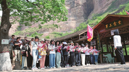 在壯麗的崖壁背景下,嘹亮的歌聲響起,《三大紀(jì)律八項(xiàng)注意》《勤儉是咱們的傳家寶》……一首首經(jīng)典旋律,將嚴(yán)明的紀(jì)律要求與樸素的廉潔觀念,通過(guò)激昂的音符直抵人心。歌聲在山谷間激蕩,廉潔的種子在集體共鳴中悄然播撒。