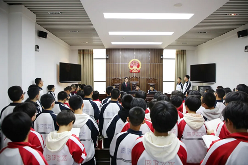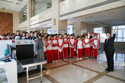 “同學(xué)們,這邊是我們的安檢通道,進(jìn)入法院的人員需要在這里接受安全檢查,所有違禁物品是不能進(jìn)入法院的。”在法院講解員的帶領(lǐng)下,同學(xué)們先后參觀了訴訟服務(wù)中心、陽光大廳、審判法庭、法治宣傳教育室、院史陳列室等場所,認(rèn)真觀看了中院全面建設(shè)專題片和中院干警自編自導(dǎo)自演的預(yù)防未成年人犯罪題材法治微電影《你依然是天使》,全面了解了法院的職能作用、機(jī)構(gòu)設(shè)置、辦案流程和歷史文化等情況。
