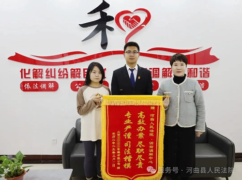 “感謝調(diào)解員為我們排憂解難,提供高效便捷的司法服務(wù),本來(lái)以為訴訟時(shí)間會(huì)很長(zhǎng),沒(méi)想到這么快就處理好了,今后我們一定努力提高服務(wù)水平?!苯?,某物業(yè)公司將一面寫(xiě)有“高效辦案盡職盡責(zé) 專業(yè)嚴(yán)謹(jǐn)司法楷?!钡腻\旗送至河曲法院訴前調(diào)解中心,對(duì)法院溫馨的訴訟服務(wù)和特邀調(diào)解員優(yōu)質(zhì)高效的調(diào)解表示感謝!