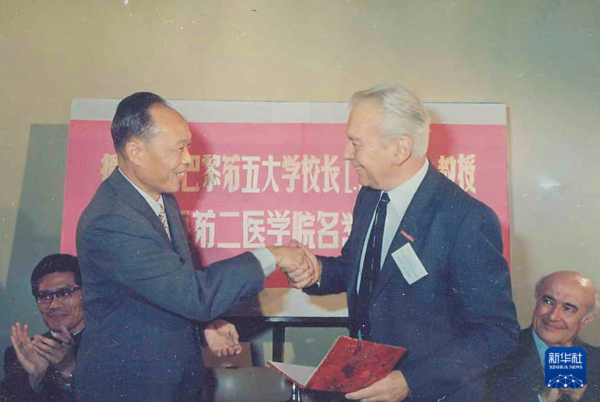 上海第二醫(yī)學(xué)院(現(xiàn)上海交通大學(xué)醫(yī)學(xué)院)校長王振義(前左)授予法國巴黎第五大學(xué)校長歐基埃名譽(yù)教授稱號(hào)(攝于1985年)。新華社發(fā)(上海交通大學(xué)醫(yī)學(xué)院供圖)