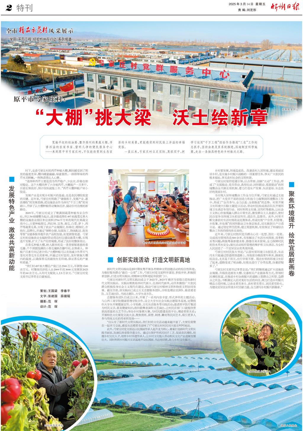 寬敞平坦的柏油路、整齊排列的果蔬大棚、書香四溢的農(nóng)家書屋、窗明幾凈的便民服務(wù)中心……來到原平市弓家莊村,不僅能欣賞到生態(tài)宜居的鄉(xiāng)村美景,更能感受到村民臉上洋溢的幸福笑容。 一直以來,弓家莊村立足實(shí)際、真抓實(shí)干,把學(xué)習(xí)運(yùn)用“千萬工程”經(jīng)驗(yàn)作為推進(jìn)“三農(nóng)”工作的總抓手,堅(jiān)持由表及里系統(tǒng)推進(jìn),因地制宜科學(xué)施策,走出一條獨(dú)具特色的鄉(xiāng)村振興之路。 ■ 發(fā)展特色產(chǎn)業(yè) 激發(fā)共富新動能 時(shí)下,走進(jìn)弓家莊村的西芹種植大棚,瞬間感受到了明顯的溫度差異,棚內(nèi)暖意融融,綠意盎然,一排排翠綠的西芹水靈鮮嫩,一陣陣清香沁人心脾。 “選擇種西芹主要是因?yàn)槲髑鄯€(wěn)產(chǎn)、少蟲災(zāi),價(jià)格也相對穩(wěn)定。這個(gè)大棚共種了六分地西芹,大概能產(chǎn)一萬多斤,目前長勢良好,預(yù)計(jì)很快就能上市?!蔽髑鄞笈锓N植戶宋小俊說。 發(fā)展產(chǎn)業(yè)是實(shí)現(xiàn)鄉(xiāng)村振興的基礎(chǔ),也是農(nóng)民增收致富的關(guān)鍵。近年來,弓家莊村明確了“建強(qiáng)班子、發(fā)展產(chǎn)業(yè)、惠農(nóng)增收”的發(fā)展思路,把設(shè)施農(nóng)業(yè)作為深化“千萬工程”的突破口,開辟了以大棚種植帶動集體經(jīng)濟(jì)、撬動鄉(xiāng)村治理的新路徑。 2009年,弓家莊村成立了聚滿園蔬菜種植專業(yè)合作社,并以50座暖棚為起點(diǎn),逐步建成擁有497座蔬菜瓜果大棚的設(shè)施農(nóng)業(yè)園區(qū)和總面積2794平方米的現(xiàn)代化果蔬交易中心,主要種植甜瓜、西紅柿、豆角、黃瓜、白菜、蘿卜、西芹等蔬菜瓜果,實(shí)現(xiàn)了農(nóng)業(yè)產(chǎn)業(yè)規(guī)?;?、標(biāo)準(zhǔn)化、精細(xì)化、市場化、品牌化,并通過“保鮮倉儲、包裝加工、物流配送、批發(fā)零售”全鏈條服務(wù)提升農(nóng)產(chǎn)品附加值,拓寬銷售渠道。弓家莊村的設(shè)施農(nóng)業(yè)也輻射帶動周邊村莊建設(shè)蔬菜大棚,實(shí)現(xiàn)連片發(fā)展,擴(kuò)大了生產(chǎn)經(jīng)營規(guī)模,形成了良好的整體效應(yīng)。 在香瓜種植大棚,映入眼簾的是一壟壟郁郁蔥蔥的香瓜藤,個(gè)個(gè)渾圓飽滿的小香瓜掩映在藤葉間,長勢喜人。種植戶呂素平向記者介紹:“大棚種植可以有效減少外界天氣變化對香瓜生長的影響,并通過實(shí)時(shí)監(jiān)控,及時(shí)掌握大棚內(nèi)的溫度,以確保香瓜的最佳生長環(huán)境,保證香瓜的產(chǎn)量和質(zhì)量?!?/p> “我們村497座大棚總產(chǎn)值已達(dá)2500萬元,年銷售1500余萬元。村集體經(jīng)濟(jì)收入由2009年的3000元發(fā)展到2023年的60余萬元,人均可支配收入2.5萬余元。”弓家莊村黨支部書記李晉忠自豪地說。 ■ 創(chuàng)新實(shí)踐活動 打造文明新高地 新時(shí)代文明實(shí)踐站是新時(shí)期統(tǒng)籌開展各類精神文明創(chuàng)建活動的綜合性陣地,為做好服務(wù)群眾“最后一公里”工作,弓家莊村黨支部科學(xué)謀劃、多措并舉,積極探索創(chuàng)新,打造文明實(shí)踐站,將精神文明陣地延伸到家門口。 弓家莊村新時(shí)代文明實(shí)踐站成立于2022年,2023年被評為省級示范性新時(shí)代文明實(shí)踐站。實(shí)踐站聚焦培養(yǎng)時(shí)代新人、弘揚(yáng)時(shí)代新風(fēng),動員和激勵廣大農(nóng)民群眾積極投身社會主義現(xiàn)代化建設(shè),推動弓家莊村精神文明和物質(zhì)文明協(xié)同發(fā)展。截至目前,該實(shí)踐站已成立五支志愿服務(wù)團(tuán)隊(duì),分別是理論宣講隊(duì)、敬老愛老隊(duì)、文藝演出隊(duì)、書畫志愿隊(duì)、大學(xué)生返鄉(xiāng)隊(duì)。 志愿服務(wù)團(tuán)隊(duì)自成立以來,開展了一系列內(nèi)容豐富、形式多樣的主題活動。與山西工商學(xué)院健康管理學(xué)院合作,設(shè)立大學(xué)生社會實(shí)踐志愿服務(wù)基地,定期組織大學(xué)生開展健康宣傳、小學(xué)助教、文化生活服務(wù)等實(shí)踐活動;邀請?jiān)结t(yī)療集團(tuán)為村民義診,普及健康知識;組織歌舞表演和文藝演出,讓村民在家門口就能欣賞到高質(zhì)量的文藝節(jié)目;舉辦鄉(xiāng)村象棋大賽,為村民搭建競技平臺,增進(jìn)鄰里關(guān)系;開展特色文化展覽交流大會,聚焦剪紙、面塑、刺繡、雕刻等民間藝術(shù),吸引更多人參與傳統(tǒng)文化的傳承和發(fā)揚(yáng)…… “自從有了新時(shí)代文明實(shí)踐站,我們村的文化活動越來越豐富了,大家經(jīng)常聚在一起學(xué)習(xí)交流,感覺生活都更有滋味了!”弓家莊村村民劉大姐樂呵呵地說。 此外,弓家莊村黨支部還以炕圍畫傳承人趙升龍為核心,著重打造新時(shí)代文明實(shí)踐書畫室,加速弘揚(yáng)省級非遺文化。通過從保護(hù)傳承民間手工藝、促進(jìn)農(nóng)民增收,挖掘鄉(xiāng)村文化人才,培育鄉(xiāng)村非遺傳承人,讓鄉(xiāng)村文化能人帶動相關(guān)文化產(chǎn)業(yè)逐漸發(fā)展壯大。同時(shí)利用鄉(xiāng)村振興實(shí)訓(xùn)基地開設(shè)炕圍畫、書法培訓(xùn)班,助力鄉(xiāng)村文化振興。 ■ 聚焦環(huán)境提升 繪就宜居新畫卷 鄉(xiāng)村要發(fā)展,環(huán)境是底色。改善農(nóng)村人居環(huán)境,建設(shè)美麗宜居鄉(xiāng)村,是實(sh