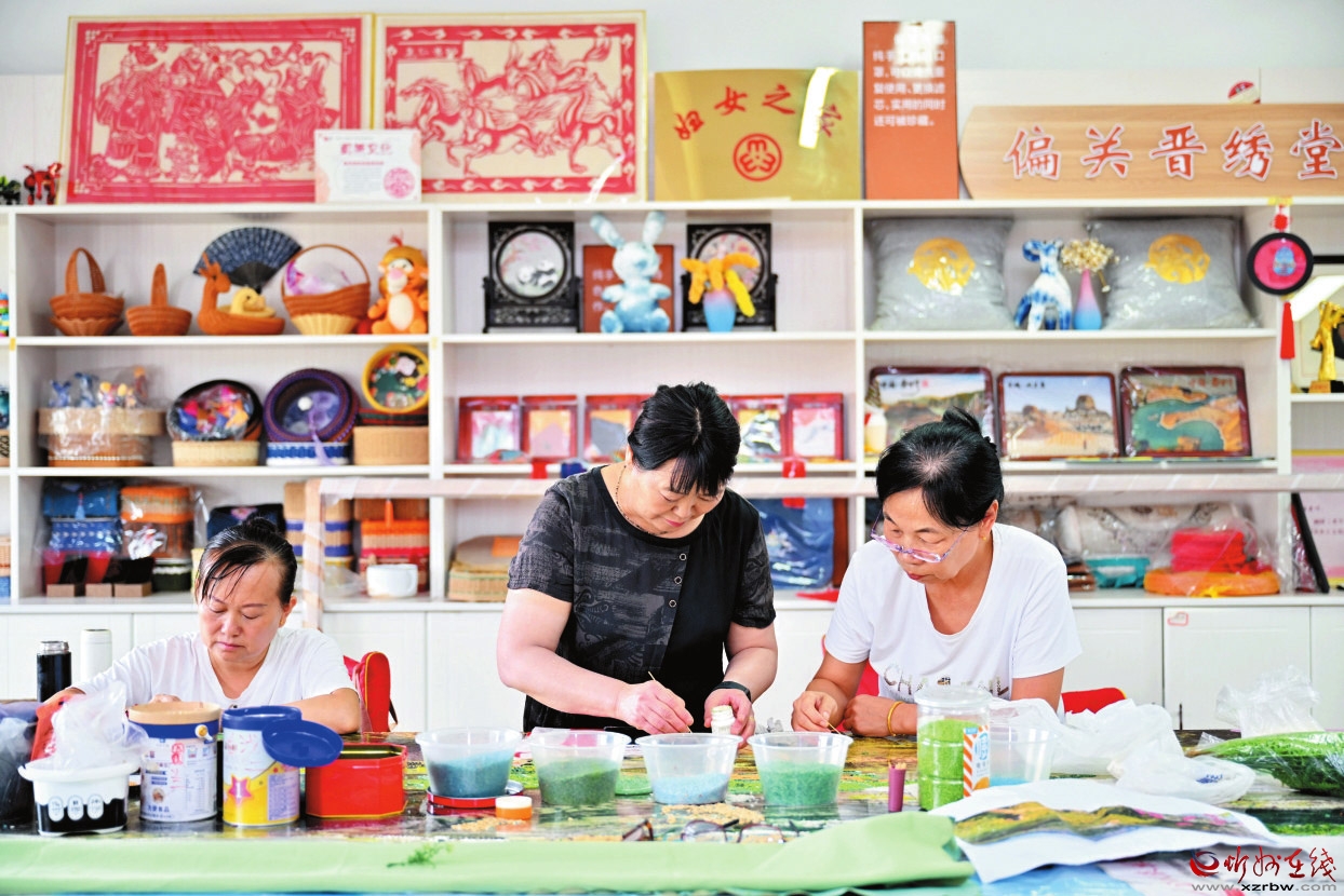 2019年,在偏關(guān)縣政府的支持下,郝果葉辦起了晉繡堂。從基礎(chǔ)針法,到設(shè)計圖案、把控品質(zhì),她手把手帶徒傳藝。馬梁村的周雪琴是最早來學(xué)的一批人中的一個,家中有個聾啞兒子需要照顧,日子過得緊巴巴。初學(xué)時,粗糙的手指捏不住繡花針,如今靠刺繡月入近3000元,“比種地輕快,還能守著娃,這雙手讓她有了底氣?!蓖ㄟ^開展專業(yè)培訓(xùn),郝果葉幫助300多名婦女學(xué)習(xí)傳統(tǒng)手藝。晉繡堂成了她們“第二個家”,在這里,針尖挑起的不只是絲線,還有挺直的腰桿和亮堂的明天。